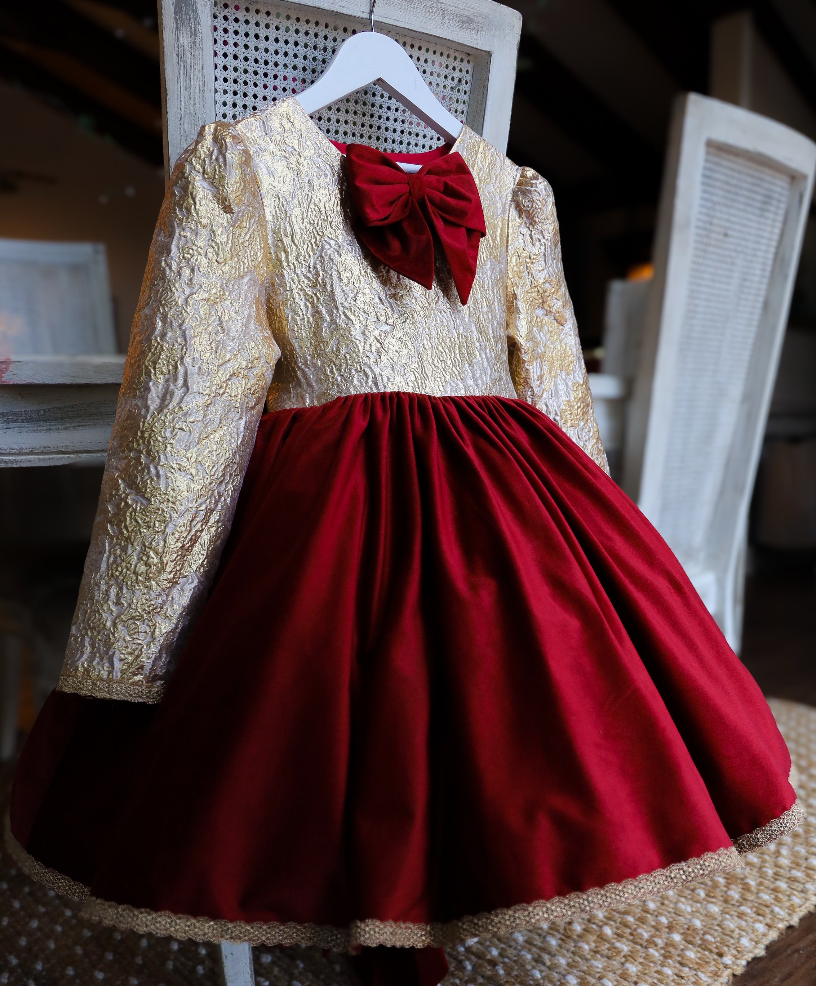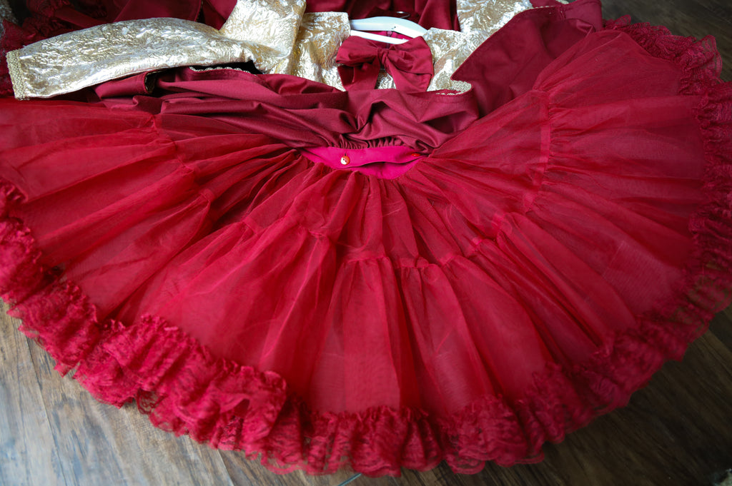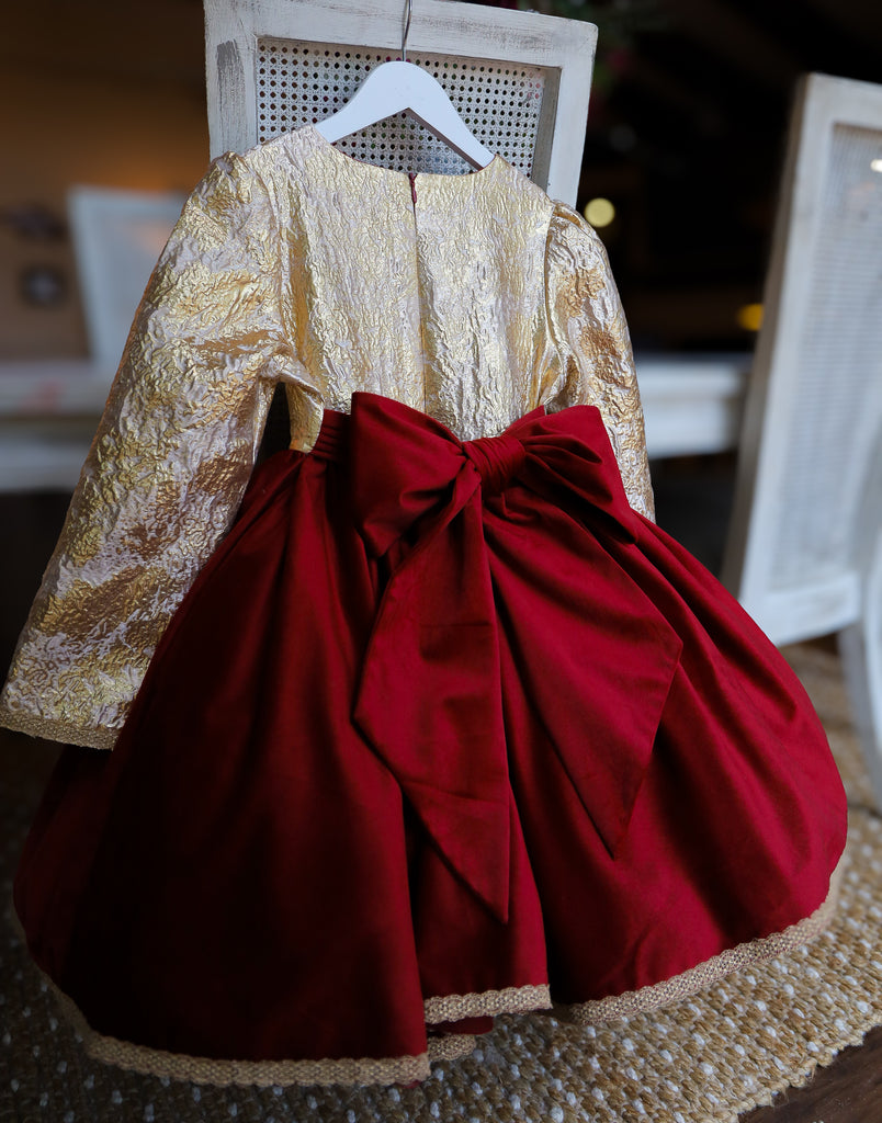 •Dress: rich red soft velvet, gold stamped brocade